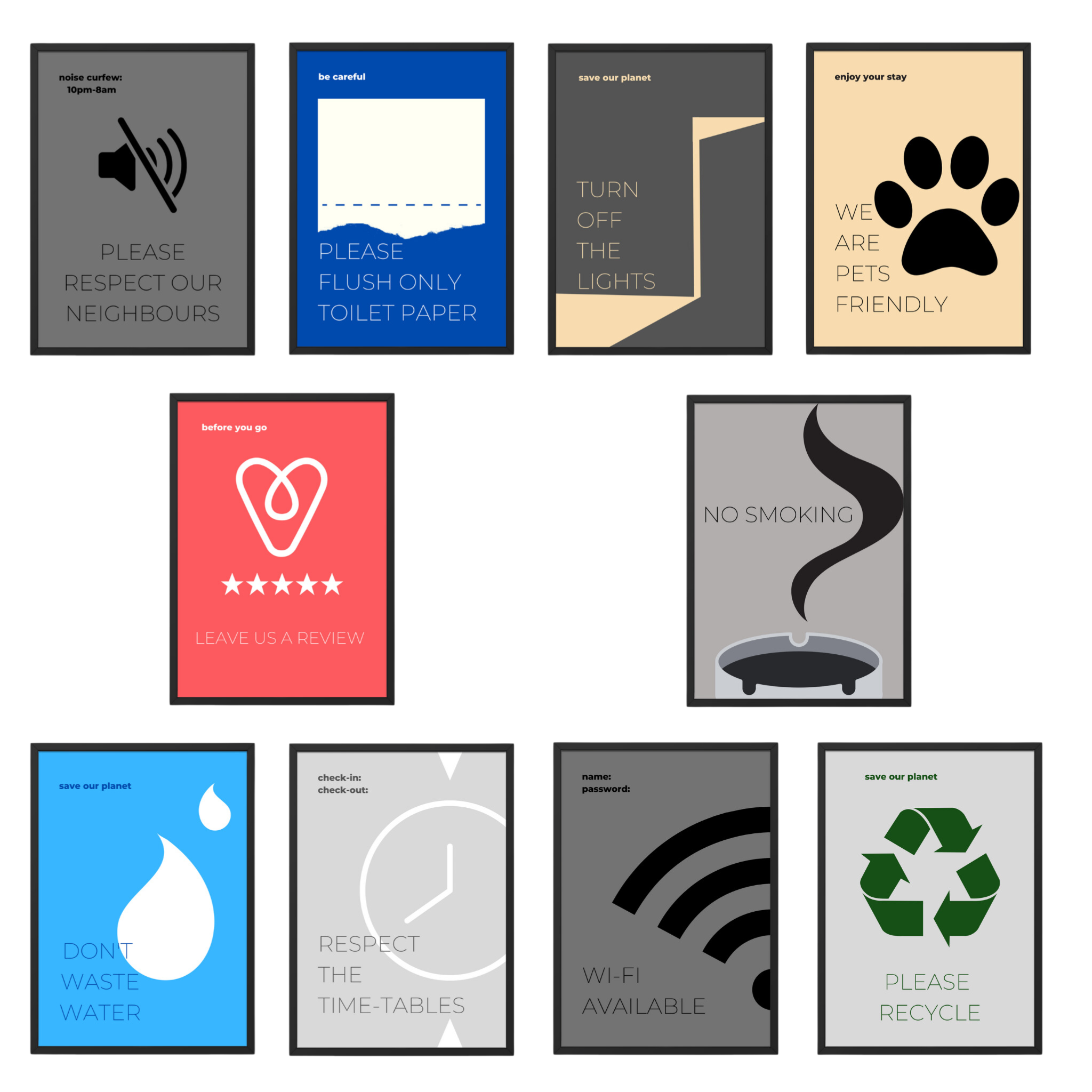 Set the tone for a memorable stay with our Home Rules Posters Pack. Enhance communication with guests and maintain a harmonious environment with visually stunning house rules.